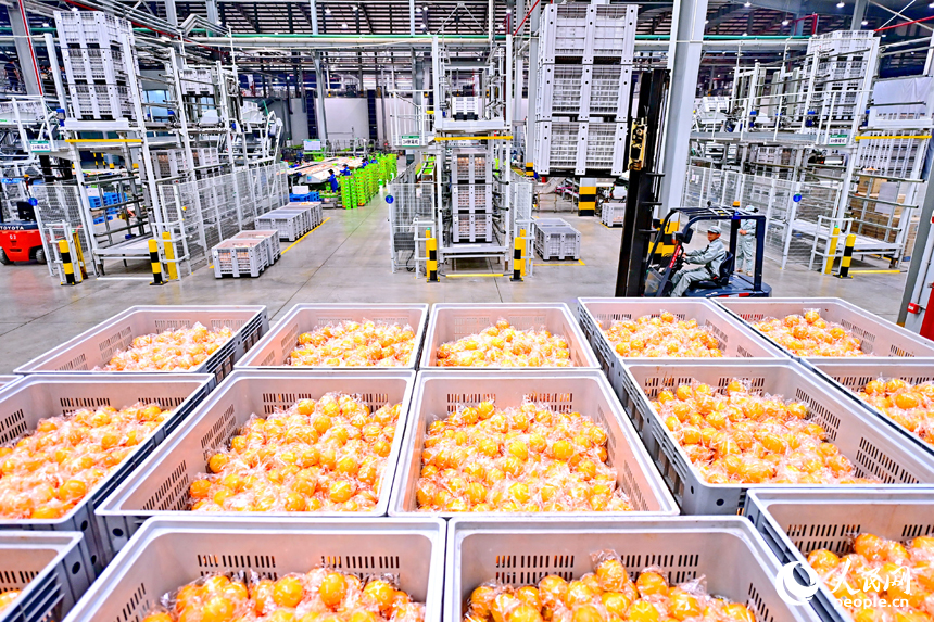 Photo shows fresh navel oranges at the “smart” workshop of a navel orange processing company in the high-tech industrial park of Xinfeng county, Ganzhou city, east China's Jiangxi Province. (People's Daily Online/Zhu Haipeng)