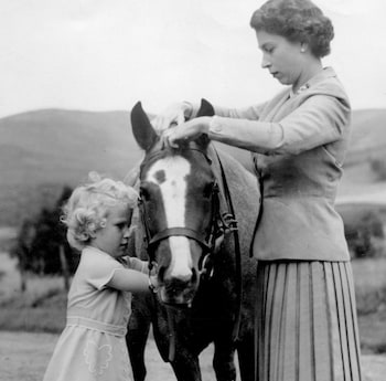The late Queen shows a young Princess Anne how to ride at Balmoral Castle