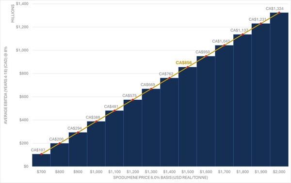 The PEA uses a long-term weighted average spodumene price assumption of US$1,375 (SC5.5,FOB Bécancour basis) per tonne. This assumed price is supported by recent market price forecasts from independent reporting agencies,banking commodities analyst reports and company disclosures and recently published technical reports,which indicate spodumene prices generally cluster around US$1,300–US$1,500 per tonne for 5.5% spodumene concentrate. Therefore,a price assumption for the PEA within this range is considered to fairly represent foreseeable longer-run market conditions applicable to the project development scenario,as compared to current spot pricing of Spodumene Concentrate US$760/t (SC6,FOB Australia basis -15/08/24).