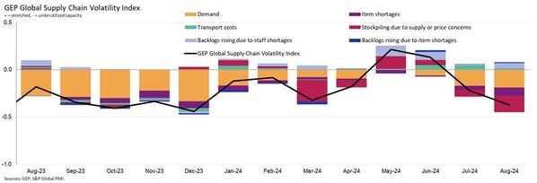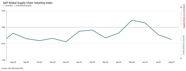 CLARK,N.J.,Sept. 11,2024 -- The GEP Global Supply Chain Volatility Index— a leading indicator tracking demand conditions,shortages,transportation costs,inventories and backlogs based on a monthly survey of 27,000 businesses —fell to -0.37 in August. This is its lowest level year-to-date (vs. -0.22 in July),signaling the highest level of spare capacity at global suppliers in 2024. This marked two successive months of underutilized capacity across the world's supply chains,and the lowest level of input demand in eight months,as global economic conditions deteriorate.