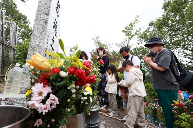 People gather every year to pay their respects to the victims of the Japan Airlines flight 123 crash near the village of Ueno,Gunma prefecture (Picture: AFP/Getty Images)